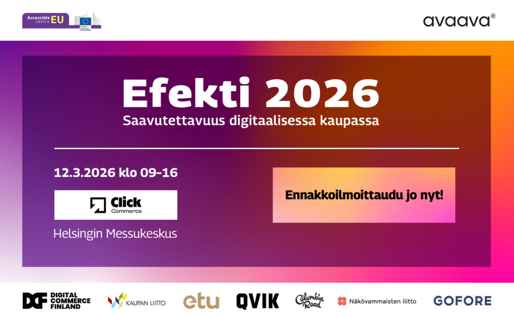 Näitä teemoja käsitellään Efekti 2026 -tapahtumassa 12.3.2026 Helsingin Messukeskuksessa osana Click Commerce -tapahtumaa. Seminaarissa digitaalisen kaupan toimijat ja asiantuntijat pureutuvat saavutettavuuteen konkreettisten esimerkkien ja käytännön ratkaisujen kautta. Suomen AccessibleEU-tapahtumien suojelijana toimii tasavallan presidentin puoliso Suzanne Innes-Stubb, ja tapahtuma toteutetaan laajassa yhteistyössä keskeisten toimijoiden kanssa. Osallistuminen on maksutonta. Tutustu ohjelmaan ja ilmoittaudu mukaan oheisesta linkistä